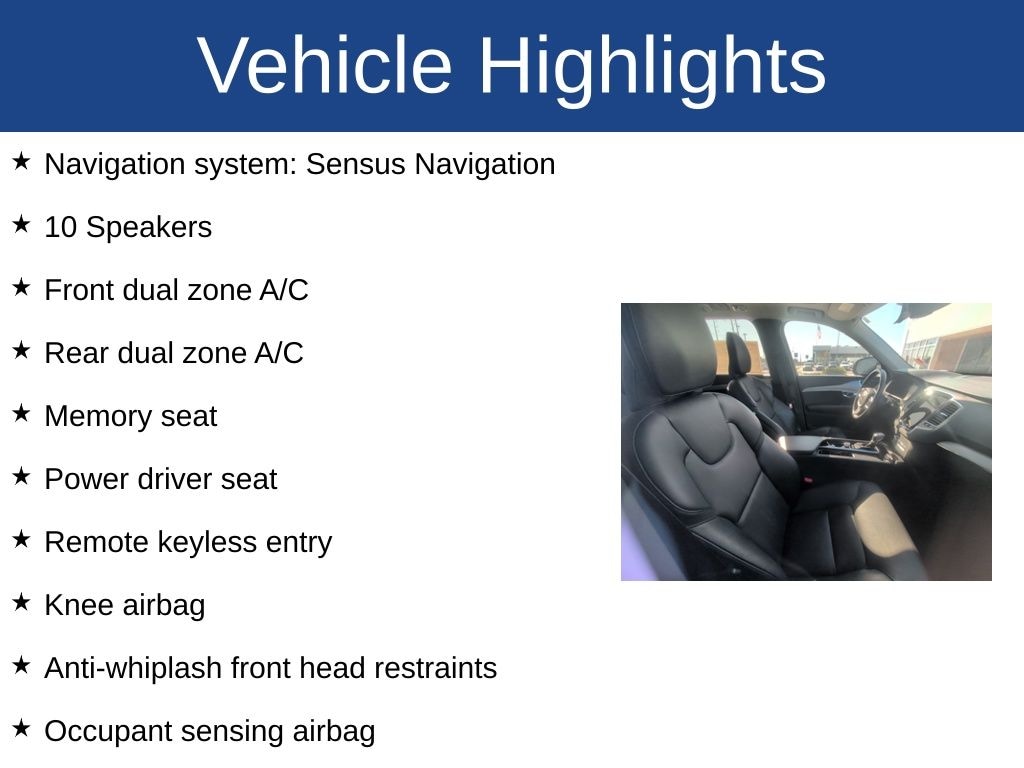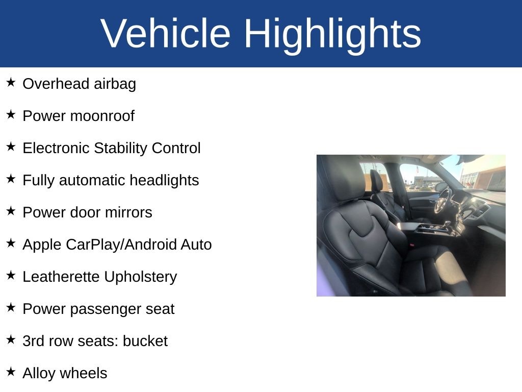 XC90 T5 Momentum, 4D Sport Utility, 2.0L I4 Turbocharged DOHC 16V LEV3-ULEV70 250hp, Automatic with Geartronic, FWD, Onyx Black Metallic, Charcoal Premium Synthetic, 10 Speakers, 3rd row seats: bucket, Alloy wheels, Anti-whiplash front head restraints, Apple CarPlay/Android Auto, Electronic Stability Control, Front dual zone A/C, Fully automatic headlights, Knee airbag, Leatherette Upholstery, Memory seat, Navigation system: Sensus Navigation, Occupant sensing airbag, Overhead airbag, Power door mirrors, Power driver seat, Power moonroof, Power passenger seat, Rain sensing wipers, Rear dual zone A/C, Remote keyless entry.