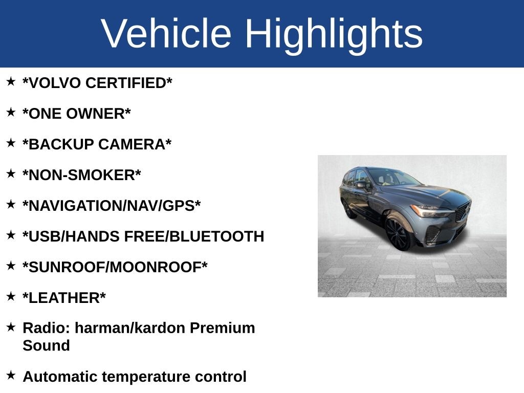 *VOLVO CERTIFIED*, *ONE OWNER*, *BACKUP CAMERA*, *NON-SMOKER*, *NAVIGATION/NAV/GPS*, *USB/HANDS FREE/BLUETOOTH, *SUNROOF/MOONROOF*, *LEATHER*, XC60 B5 Plus Dark Theme, 4D Sport Utility, 2.0L I4 Turbocharged, Automatic with Geartronic, FWD, Denim Blue Metallic, Blond Leather, Alloy wheels, Apple CarPlay, Auto-dimming Rear-View mirror, Automatic temperature control, Dual front impact airbags, Dual front side impact airbags, Front Bucket Seats, Front Center Armrest, Front fog lights, Fully automatic headlights, Heated Front Seats, Leather Upholstery, Memory seat, Power door mirrors, Power driver seat, Power moonroof, Power passenger seat, Radio: harman/kardon Premium Sound, Rain sensing wipers, Security system, Spoiler, Wheels: 19" 5-V Spoke Black Diamond Cut Alloy.