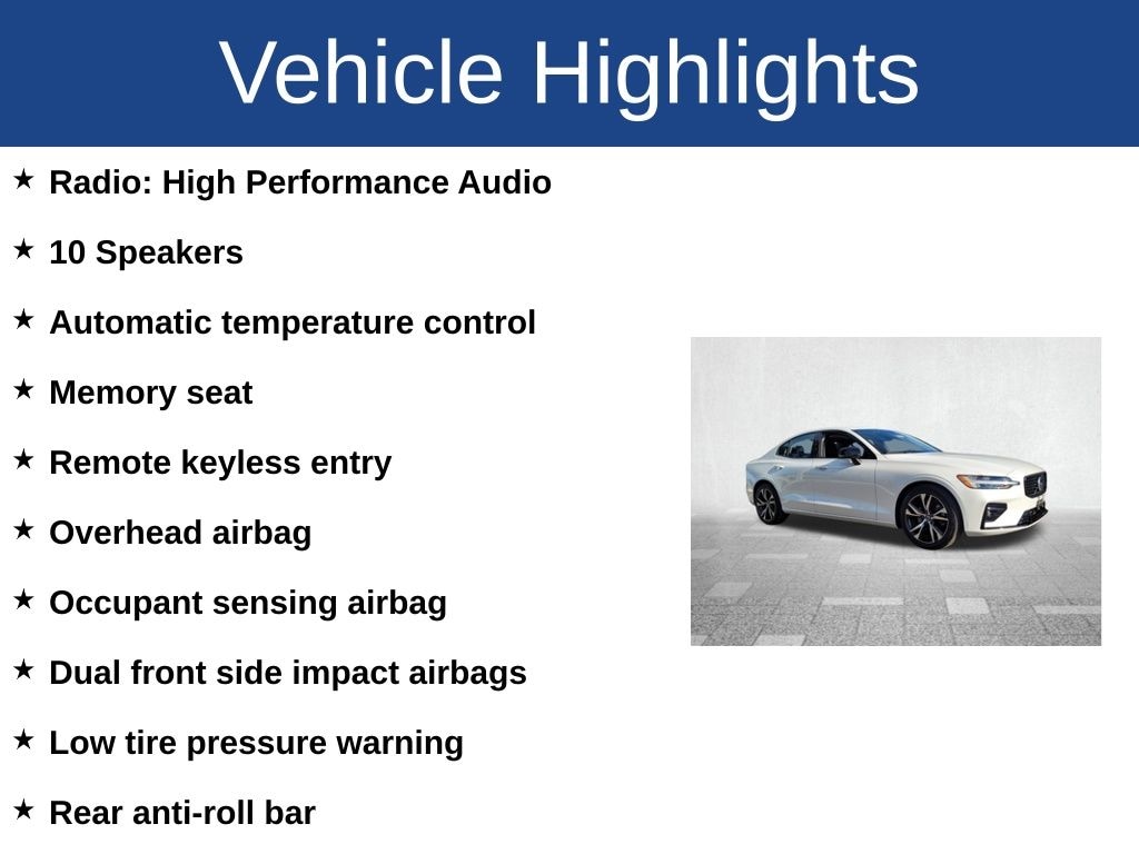 S60 B5 Core Dark Theme, 4D Sedan, 2.0L I4, Automatic with Geartronic, FWD, White, Charcoal Artificial Leather, 10 Speakers, Anti-whiplash front head restraints, Apple CarPlay, Automatic temperature control, Dual front impact airbags, Dual front side impact airbags, Electronic Stability Control, Exterior Parking Camera Rear, Front Bucket Seats, Front fog lights, Heated door mirrors, Illuminated entry, Leatherette Seating Surfaces, Low tire pressure warning, Memory seat, Occupant sensing airbag, Overhead airbag, Power moonroof, Radio: High Performance Audio, Rear anti-roll bar, Rear fog lights, Rear reading lights, Remote keyless entry, Security system, Turn signal indicator mirrors, Wheels: 18" 5-Spoke Black Diamond-Cut Alloy.