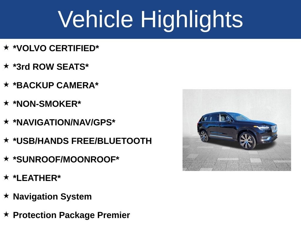 *VOLVO CERTIFIED*, *3rd ROW SEATS*, *BACKUP CAMERA*, *NON-SMOKER*, *NAVIGATION/NAV/GPS*, *USB/HANDS FREE/BLUETOOTH, *SUNROOF/MOONROOF*, *LEATHER*, XC90 B6 Plus Bright Theme, 4D Sport Utility, 2.0L I4 Turbocharged DOHC 16V LEV3-ULEV70, Automatic with Geartronic, AWD, Onyx Black Metallic, Blond Leather, 10 Speakers, 3rd row seats: bucket, All-Weather Floor Mats, Alloy wheels, Apple CarPlay, Auto-dimming door mirrors, Auto-dimming Rear-View mirror, Automatic temperature control, Bumper Cover, Cargo Tray, Exterior Parking Camera Rear, First Aid Kit, Front Bucket Seats, Front dual zone A/C, Front fog lights, Fully automatic headlights, Heated Front Bucket Seats, Heated rear seats, Heated steering wheel, Leather Shift Knob, Leather Upholstery, Memory seat, Navigation System, Power Liftgate, Power moonroof, Protection Package Premier, Rain sensing wipers, Rear dual zone A/C, Rear seat center armrest, Remote keyless entry, Security system, Speed control, Spoiler, Telescoping steering wheel, Wheel Locks.