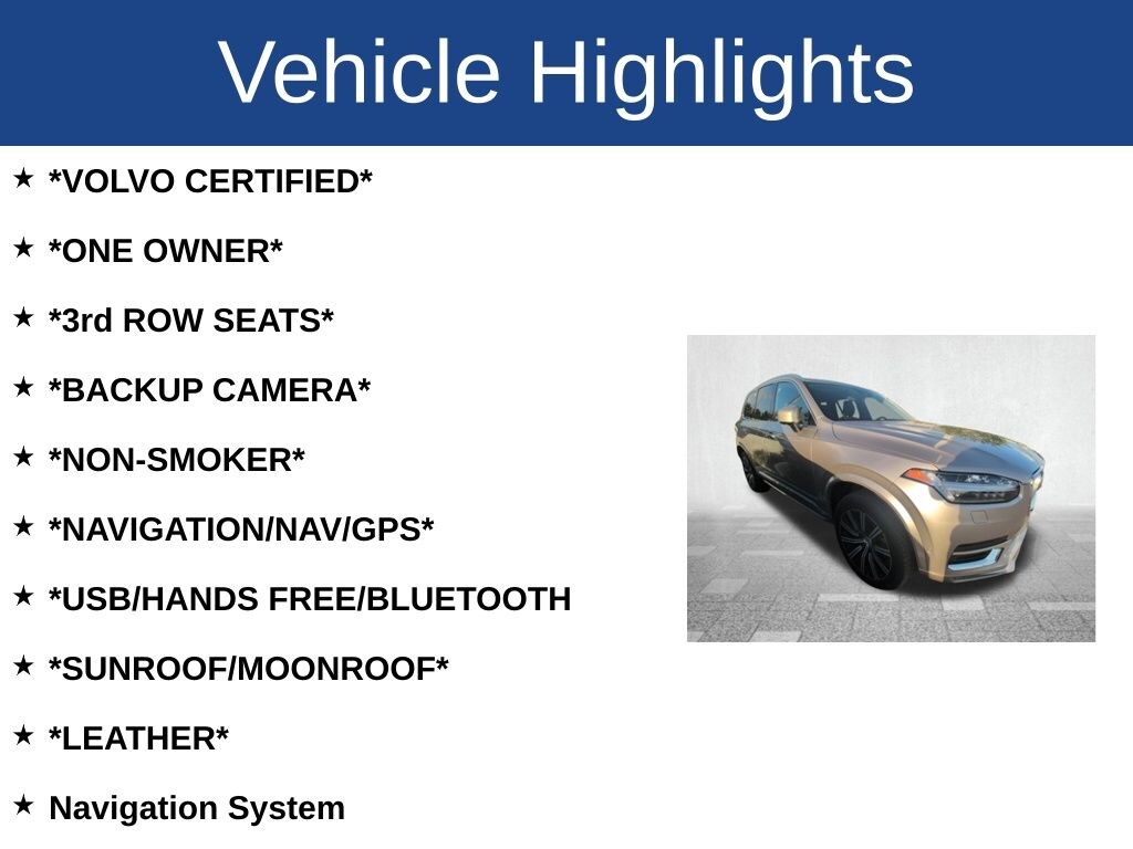 *VOLVO CERTIFIED*, *ONE OWNER*, *3rd ROW SEATS*, *BACKUP CAMERA*, *NON-SMOKER*, *NAVIGATION/NAV/GPS*, *USB/HANDS FREE/BLUETOOTH, *SUNROOF/MOONROOF*, *LEATHER*, XC90 B6 Plus Bright Theme, 4D Sport Utility, 2.0L I4 Turbocharged DOHC 16V LEV3-ULEV70, Automatic with Geartronic, AWD, Bright Dusk Metallic, Charcoal Leather, 10 Speakers, 3rd row seats: bucket, Alloy wheels, Apple CarPlay, Auto-dimming door mirrors, Auto-dimming Rear-View mirror, Dual front side impact airbags, Emergency communication system: Volvo Cars App w/4 Year Subscription, Exterior Parking Camera Rear, Front Bucket Seats, Front dual zone A/C, Front fog lights, Fully automatic headlights, Headlight cleaning, Heated door mirrors, Heated Front Bucket Seats, Heated rear seats, Memory seat, Navigation System, Outside temperature display, Power driver seat, Power moonroof, Rain sensing wipers, Rear dual zone A/C, Rear seat center armrest, Remote keyless entry, Security system, Wheels: 20" 10-Spoke Black Diamond Cut Alloy.