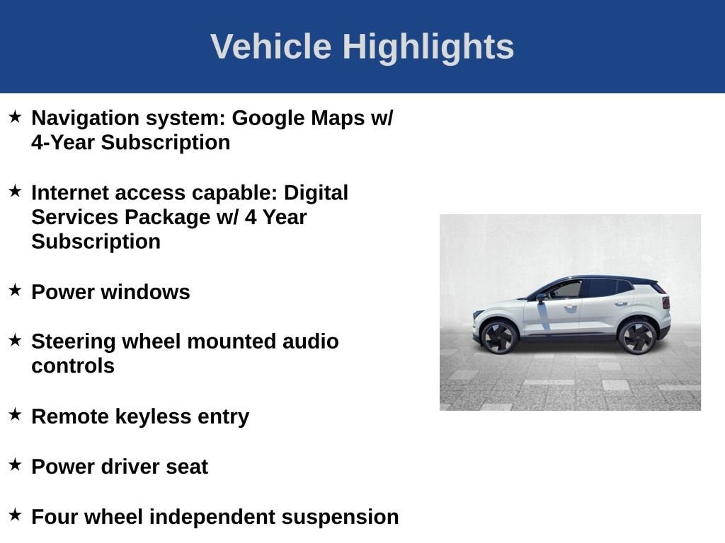 4D Sport Utility, Electric Motor, 1-Speed Automatic, AWD, 70700, Pine Pixel Knit/Nordico Cloth, Alloy wheels, Apple CarPlay, Auto High-beam Headlights, Delay-off headlights, Four wheel independent suspension, Front Bucket Seats, Heated door mirrors, Internet access capable: Digital Services Package w/ 4 Year Subscription, Navigation system: Google Maps w/ 4-Year Subscription, Nordico & Textile Upholstery, Power driver seat, Power Liftgate, Power passenger seat, Power windows, Remote keyless entry, Split folding rear seat, Steering wheel mounted audio controls. Internet access capable: Digital Services Package w/ 4 Year Subscription, 4D Sport Utility, Electric Motor, 1-Speed Automatic, AWD, 70700, Pine Pixel Knit/Nordico Cloth, Alloy wheels, Apple CarPlay, Auto High-beam Headlights, Delay-off headlights, Four wheel independent suspension, Front Bucket Seats, Heated door mirrors, Navigation system: Google Maps w/ 4-Year Subscription, Nordico & Textile Upholstery, Power driver seat, Power Liftgate, Power passenger seat, Power windows, Remote keyless entry, Split folding rear seat, Steering wheel mounted audio controls, 4-Wheel Disc Brakes, 9 Speakers, ABS brakes, Air Conditioning, AM/FM radio: SiriusXM, Auto-dimming door mirrors, Auto-dimming Rear-View mirror, Automatic temperature control, Brake assist, Bumpers: body-color, Driver door bin, Driver vanity mirror, Dual front impact airbags, Dual front side impact airbags, Electronic Stability Control, Emergency communication system: Volvo Cars App w/4 Year Subscription, Front anti-roll bar, Front Center Armrest w/Storage, Front dual zone A/C, Front reading lights, Fully automatic headlights, harman/kardon® Premium Sound System, harman/kardon® Speakers, Illuminated entry, Low tire pressure warning, Occupant sensing airbag, Outside temperature display, Overhead airbag, Overhead console, Panic alarm, Passenger door bin, Passenger vanity mirror, Power door mirrors, Radio data system, Rain sensing wipers, Rear anti-roll bar, Rear fog lights, Rear reading lights, Rear window defroster, Rear window wiper, Security system, Speed control, Spoiler, Sport steering wheel, Telescoping steering wheel, Tilt steering wheel, Traction control, Trip computer, Turn signal indicator mirrors, Variably intermittent wipers, and Wheels: 19" 5-Spoke Aero.