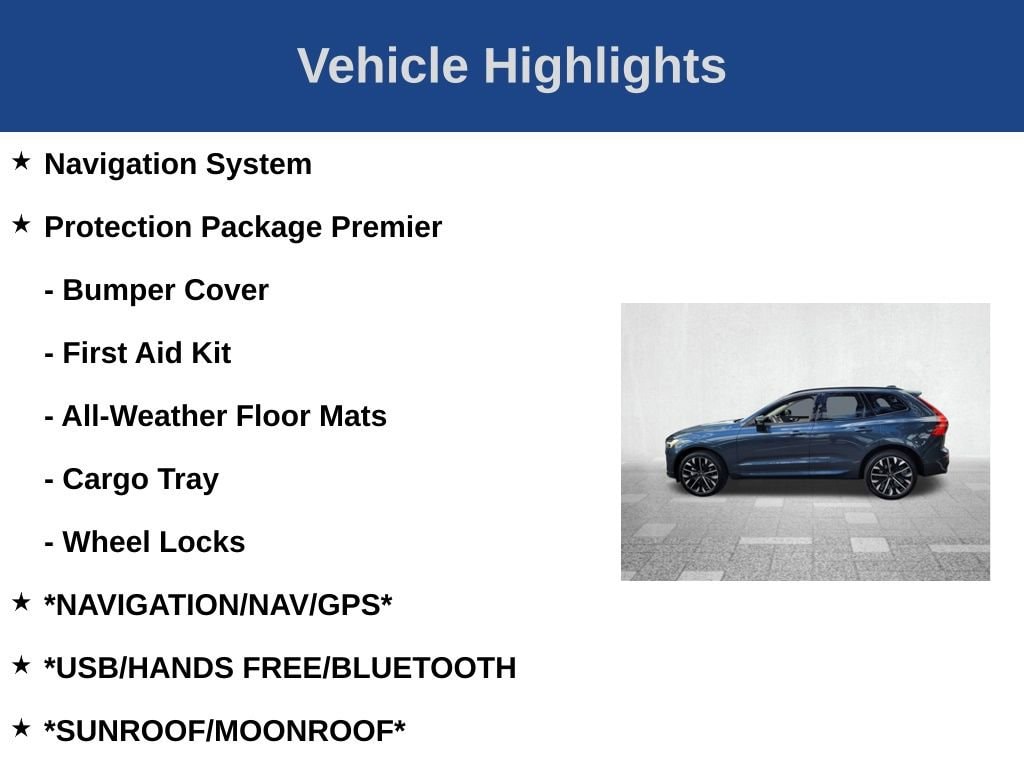 *NAVIGATION/NAV/GPS*, *USB/HANDS FREE/BLUETOOTH, *SUNROOF/MOONROOF*, *LEATHER*, XC60 B5 Ultra, 4D Sport Utility, 2.0L I4 Turbocharged DOHC 16V LEV3-ULEV70, Automatic with Geartronic, AWD, Denim Blue Metallic, Blond Leather, All-Weather Floor Mats, Auto High-beam Headlights, Bumper Cover, Cargo Tray, Exterior Parking Camera Rear, First Aid Kit, Front Bucket Seats, Front Center Armrest, Heads-Up Display, Heated front seats, Heated Rear Seats, Massage Front Seats, Memory seat, Navigation System, Perforated Nappa Leather Upholstery, Power driver seat, Power Liftgate, Power moonroof, Power windows, Protection Package Premier, Remote keyless entry, Wheel Locks. Protection Package Premier (All-Weather Floor Mats, Bumper Cover, Cargo Tray, First Aid Kit, and Wheel Locks), Climate Package (Heated Rear Seats and Heated Steering Wheel), XC60 B5 Ultra, 4D Sport Utility, 2.0L I4 Turbocharged DOHC 16V LEV3-ULEV70, Automatic with Geartronic, AWD, Denim Blue Metallic, Blond Leather, Auto High-beam Headlights, Exterior Parking Camera Rear, Front Bucket Seats, Front Center Armrest, Heads-Up Display, Heated front seats, Massage Front Seats, Memory seat, Navigation System, Perforated Nappa Leather Upholstery, Power driver seat, Power Liftgate, Power moonroof, Power windows, Remote keyless entry, 14 Speakers, 4-Wheel Disc Brakes, ABS brakes, Air Conditioning, Alloy wheels, AM/FM radio: SiriusXM, Anti-whiplash front head restraints, Auto-dimming door mirrors, Auto-dimming Rear-View mirror, Automatic temperature control, Brake assist, Bumpers: body-color, Delay-off headlights, Driver door bin, Driver vanity mirror, Dual front impact airbags, Dual front side impact airbags, Electronic Stability Control, Emergency communication system: Volvo Cars App w/4 Year Subscription, Four wheel independent suspension, Front anti-roll bar, Front dual zone A/C, Front reading lights, Fully automatic headlights, Garage door transmitter: HomeLink, Genuine wood console insert, Genuine wood dashboard insert, harman/kardon® Speakers, Heated door mirrors, Illuminated entry, Knee airbag, Leather steering wheel, Low tire pressure warning, Occupant sensing airbag, Outside temperature display, Overhead airbag, Panic alarm, Passenger door bin, Passenger vanity mirror, Power door mirrors, Power passenger seat, Power steering, Radio data system, Rain sensing wipers, Rear air conditioning, Rear anti-roll bar, Rear dual zone A/C, Rear fog lights, Rear reading lights, Rear seat center armrest, Rear window defroster, Rear window wiper, Security system, Speed control, Split folding rear seat, Spoiler, Steering wheel mounted audio controls, Tachometer, Telescoping steering wheel, Tilt steering wheel, Traction control, Trip computer, Turn signal indicator mirrors, Variably intermittent wipers, and Ventilated front seats.