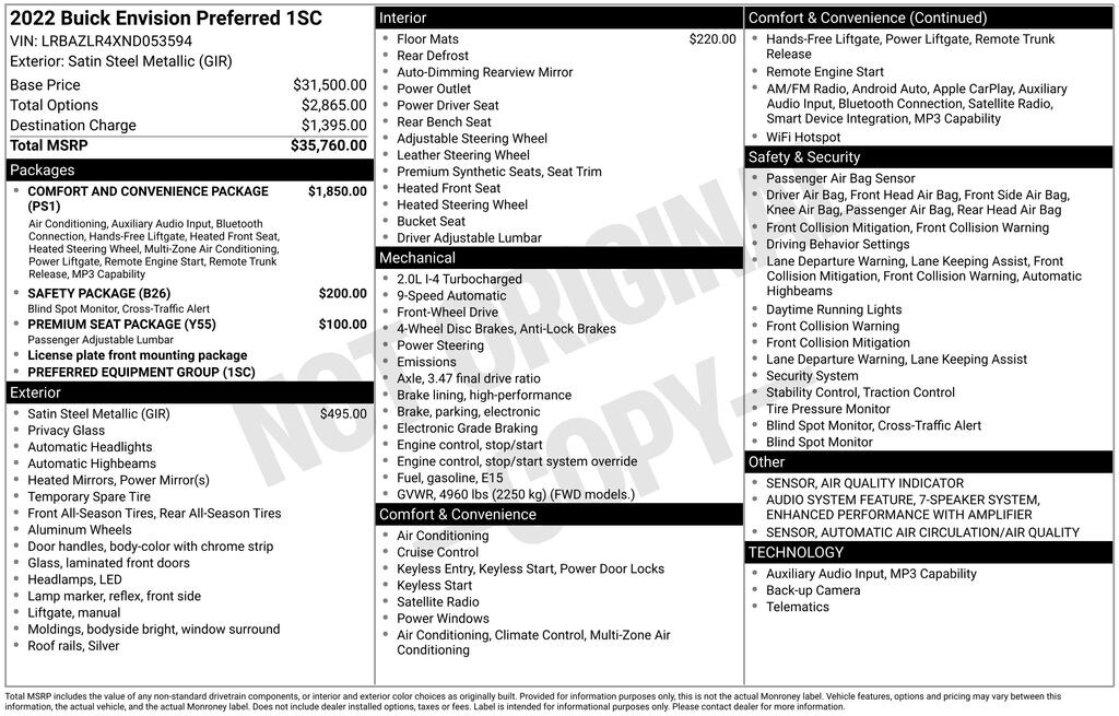 Envision Preferred, 4D Sport Utility, 2.0L Turbocharged, 9-Speed Automatic, FWD, Satin Steel Metallic, Ebony Seats Cloth, 7-Speaker Audio System Feature w/Amplifier, Air Quality Indicator Sensor, Alloy wheels, Automatic Air Circulation/Air Quality Sensor, Comfort & Convenience Package, Driver 4-Way Power Lumbar Seat Adjuster, Dual-Zone ACC Air Conditioning, Hands Free Power Programmable Liftgate, Heated Driver & Front Passenger Seats, Heated Steering Wheel, Lane Change Alert w/Side Blind Zone Alert, Preferred Equipment Group 1SC, Premium Seat Package, Radio: Buick Infotainment System AM/FM Stereo, Rear Cross Traffic Alert, Remote Vehicle Starter System, Safety Package, SiriusXM Radio, Wireless Apple CarPlay/Wireless Android Auto.