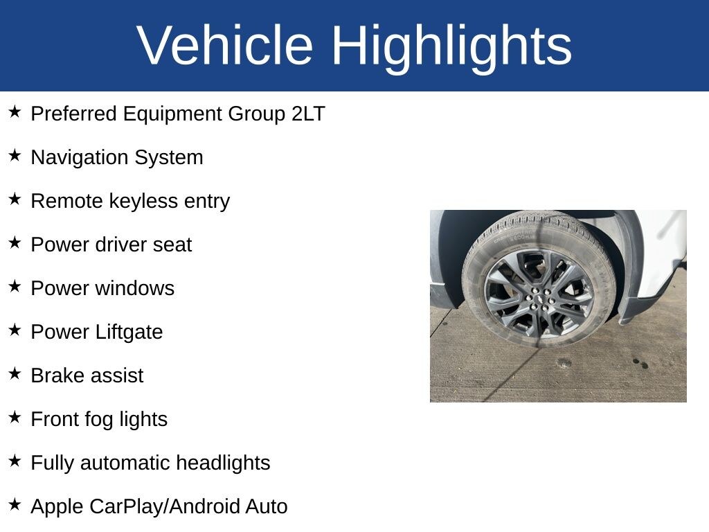Traverse RS, 4D Sport Utility, 3.6L V6 SIDI VVT, 9-Speed Automatic, FWD, Summit White, Black Leather, 3rd row seats: split-bench, 7-Passenger Seating (2-2-3 Seating Configuration), Alloy wheels, Apple CarPlay/Android Auto, Auto-dimming Rear-View mirror, Brake assist, Front Bucket Seats, Front Center Armrest, Front fog lights, Fully automatic headlights, Heated front seats, Hitch Guidance w/Hitch View, Leather-Appointed Seat Trim, Navigation System, Power driver seat, Power Liftgate, Power passenger seat, Power windows, Preferred Equipment Group 2LT, Remote keyless entry.
