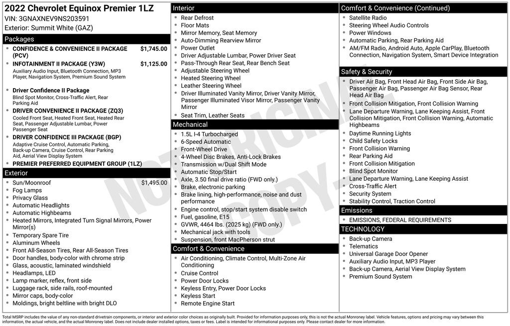 Equinox Premier, 4D Sport Utility, 1.5L DOHC, 6-Speed Automatic Electronic with Overdrive, FWD, Summit White, Jet Black Leather, 8-Way Power Front Passenger Seat Adjuster, Adaptive Cruise Control, Automatic Front & Rear Parking Assist, Bluetooth® For Phone, Bose Premium 7-Speaker Audio System Feature, Confidence & Convenience II Package, Driver Confidence III Package, Driver Convenience II Package, HD Surround Vision, Heated Rear Outboard Seating Positions, Infotainment II Package, Memory seat, Power driver seat, Power Liftgate, Power steering, Power Sunroof, Power windows, Preferred Equipment Group 1LZ, Radio: Chevrolet Infotainment 3 Plus System w/Navi, Ventilated Driver Seat, Ventilated Front Passenger Seat.