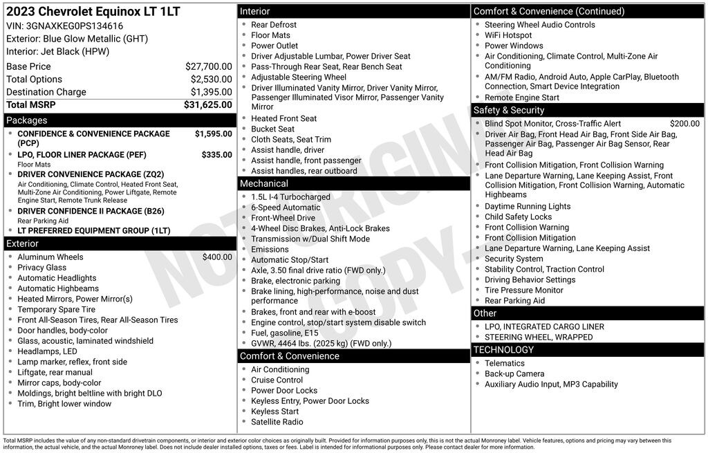 Equinox LT, 4D Sport Utility, 1.5L DOHC, 6-Speed Automatic Electronic with Overdrive, FWD, Blue Glow Metallic, Jet Black Cloth, 18" Aluminum Wheels, 2-Way Power Driver Lumbar Control Seat Adjuster, Auto High-beam Headlights, Bluetooth® For Phone, Confidence & Convenience Package, Driver 8-Way Power Seat Adjuster, Driver Confidence II Package, Driver Convenience Package, Dual-Zone Automatic Climate Control, Front & Rear Park Assist, Front Bucket Seats, Heated Driver & Front Passenger Seats, Illuminated entry, Power driver seat, Preferred Equipment Group 1LT, Premium audio system: Chevrolet Infotainment 3, Rear Power Liftgate, Remote keyless entry, Remote Start, Wrapped Steering Wheel.