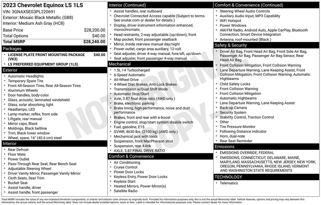 Equinox LS, 4D Sport Utility, 1.5L DOHC, 6-Speed Automatic Electronic with Overdrive, AWD, Mosaic Black Metallic, Medium Ash Gray Cloth, Alloy wheels, Bluetooth® For Phone, Driver 4-Way Manual Seat Adjuster, Driver door bin, Driver vanity mirror, Front Bucket Seats, Front Center Armrest, Front Passenger 4-Way Manual Seat Adjuster, Heated door mirrors, Power steering, Power windows, Preferred Equipment Group 1LS, Remote keyless entry.