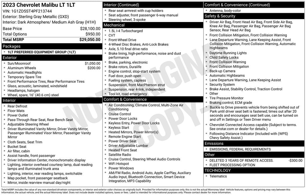 Malibu LT 1LT, 4D Sedan, 1.5L DOHC, CVT, FWD, Sterling Gray Metallic, Gray Cloth, 18" Bright Machined Aluminum Wheels, 8-Way Power Driver Seat Adjuster, Apple CarPlay/Android Auto, Auto High-beam Headlights, Exterior Parking Camera Rear, Front Bucket Seats, Heated Driver & Front Passenger Seats, Heated front seats, Power Tilt-Sliding Sunroof, Power windows, Preferred Equipment Group 1LT, Premium audio system: Chevrolet Infotainment 3 Plus, Remote keyless entry, SiriusXM Radio.