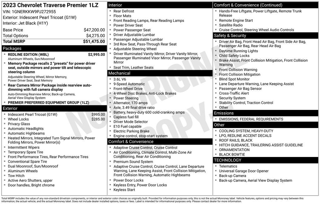 Traverse Premier, 4D Sport Utility, 3.6L V6 SIDI VVT, 9-Speed Automatic, FWD, Iridescent Pearl Tricoat, Jet Black Leather, 3rd row seats: split-bench, 8-Way Power Driver Seat Adjuster, Apple CarPlay/Android Auto, Black Bowtie, Black Door Handles, Black Roof Rails, Bose Premium 10-Speaker Audio System Feature, Dual SkyScape 2-Panel Power Sunroof, Front Bucket Seats, Front Center Armrest, Heated 2nd Row Outboard Position Seats, Heated Driver & Front Passenger Seats, Heavy-Duty Cooling System, Hitch Guidance w/Hitch View, Memory seat, Navigation System, Ornamentation, Power driver seat, Power windows, Preferred Equipment Group 1LZ, Premium audio system: Chevrolet Infotainment 3 Plus, Redline Accent Decals (LPO), Redline Edition, Trailering Assist Guidelines, Trailering Equipment, Ventilated Driver & Front Passenger Seats, Wheels: 20" Gloss Black Painted Alum w/Red Stripes.