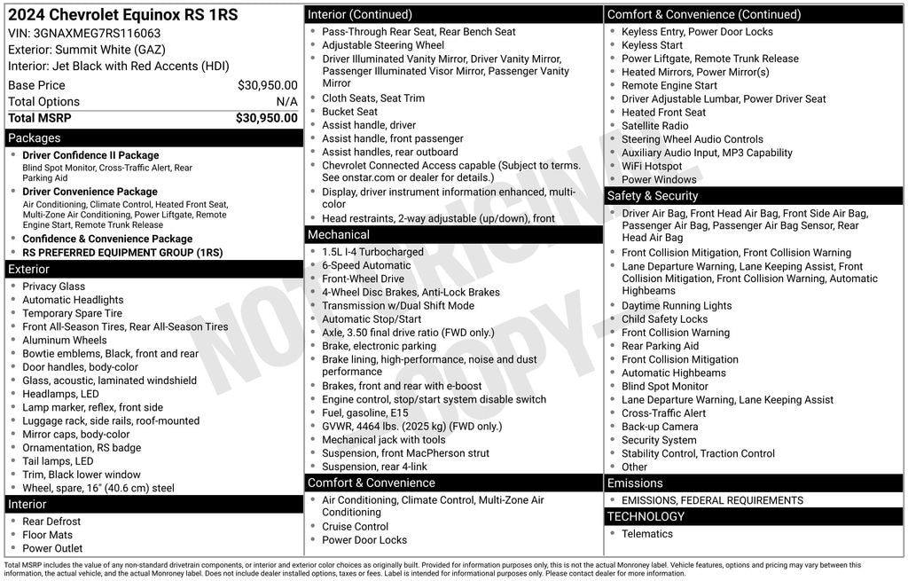 Equinox RS, 4D Sport Utility, 1.5L DOHC, 6-Speed Automatic Electronic with Overdrive, FWD, Summit White, Jet Black With Red Accents Cloth, Alloy wheels, Auto High-beam Headlights, Bluetooth® For Phone, Driver 8-Way Power Seat Adjuster, Front Bucket Seats, Front Center Armrest, Front Passenger 4-Way Manual Seat Adjuster, Heated Driver & Front Passenger Seats, Heated front seats, Power driver seat, Power Liftgate, Preferred Equipment Group 1RS, Premium audio system: Chevrolet Infotainment 3, Remote keyless entry.