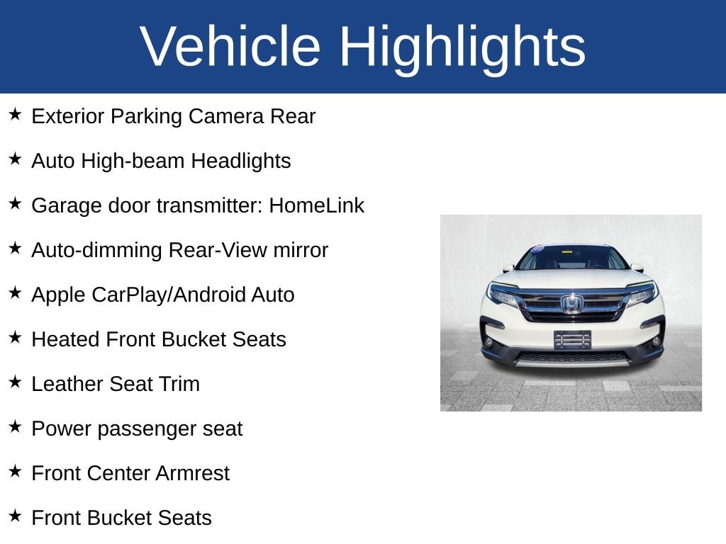 Pilot Touring 7 Passenger, 4D Sport Utility, 3.5L V6 24V SOHC i-VTEC, 9-Speed Automatic, AWD, Beige, Beige Leather, 3rd row seats: split-bench, Apple CarPlay/Android Auto, Auto High-beam Headlights, Auto-dimming Rear-View mirror, Blind Spot Information (BSI) System warning, Exterior Parking Camera Rear, Front Bucket Seats, Front Center Armrest, Garage door transmitter: HomeLink, Heated Front Bucket Seats, Heated rear seats, Leather Seat Trim, Memory seat, Navigation system: Honda Satellite-Linked Navigation System, Power driver seat, Power Liftgate, Power moonroof, Power passenger seat, Power steering, Power windows, Remote keyless entry.