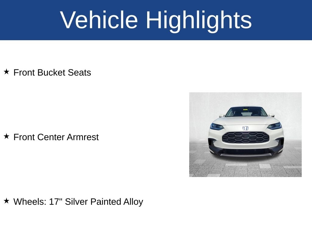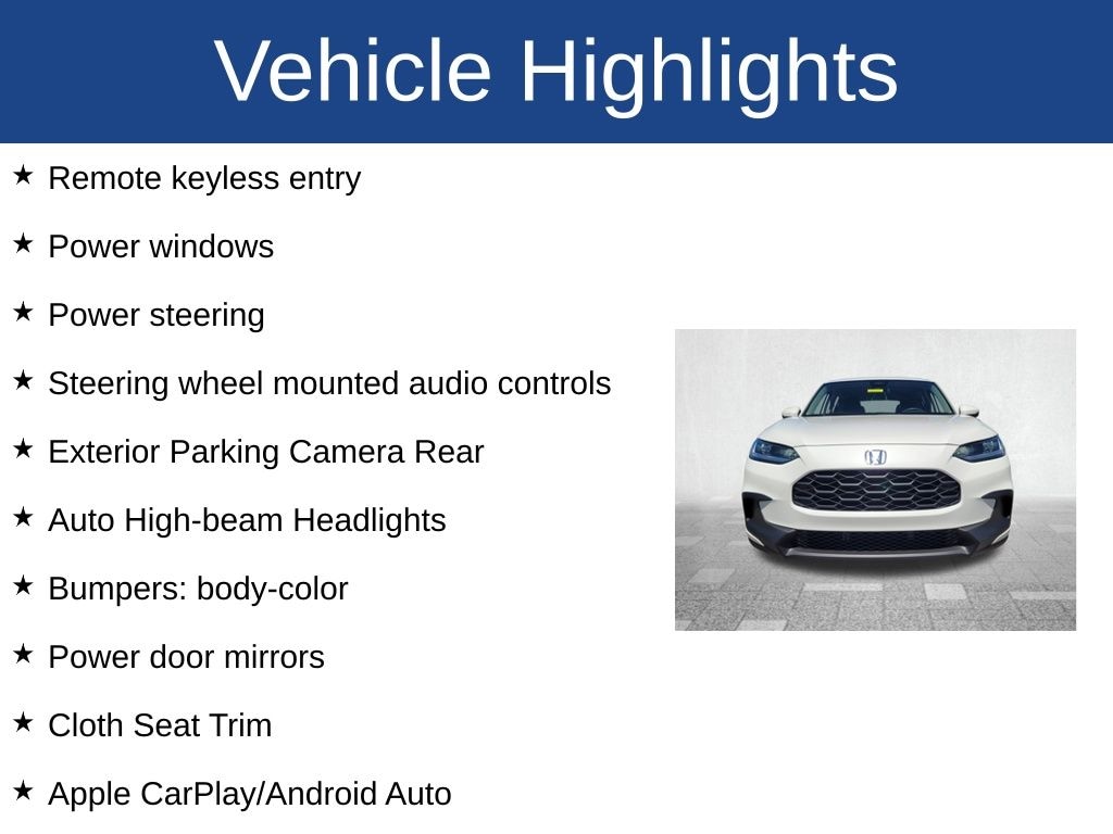 HR-V LX, 4D Sport Utility, 2.0L I4 DOHC 16V i-VTEC, CVT, AWD, White, Black Cloth, Apple CarPlay/Android Auto, Auto High-beam Headlights, Bumpers: body-color, Cloth Seat Trim, Exterior Parking Camera Rear, Front Bucket Seats, Front Center Armrest, Power door mirrors, Power steering, Power windows, Remote keyless entry, Steering wheel mounted audio controls, Wheels: 17" Silver Painted Alloy.