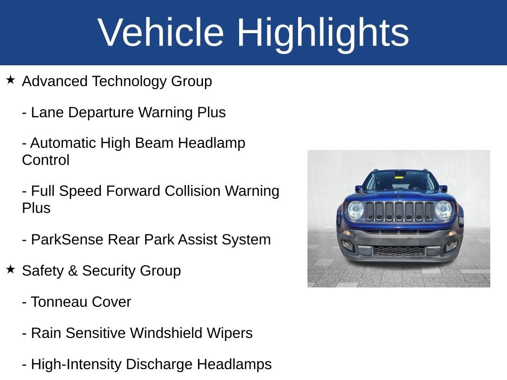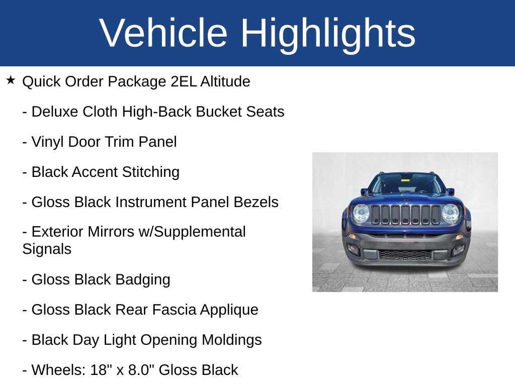 Renegade Altitude, 4D Sport Utility, 2.4L I4, 9-Speed 948TE Automatic, FWD, Jetset Blue, Black Cloth, Advanced Technology Group, Altitude Package, Automatic High Beam Headlamp Control, Black Accent Stitching, Black Day Light Opening Moldings, Blind Spot & Cross Path Detection, Deluxe Cloth High-Back Bucket Seats, Exterior Mirrors w/Supplemental Signals, Full Speed Forward Collision Warning Plus, Gloss Black Badging, Gloss Black Instrument Panel Bezels, Gloss Black Rear Fascia Applique, High-Intensity Discharge Headlamps, Lane Departure Warning Plus, ParkSense Rear Park Assist System, Quick Order Package 2EL Altitude, Rain Sensitive Windshield Wipers, Safety & Security Group, Security Alarm, Tonneau Cover, Vinyl Door Trim Panel, Wheels: 18" x 8.0" Gloss Black.