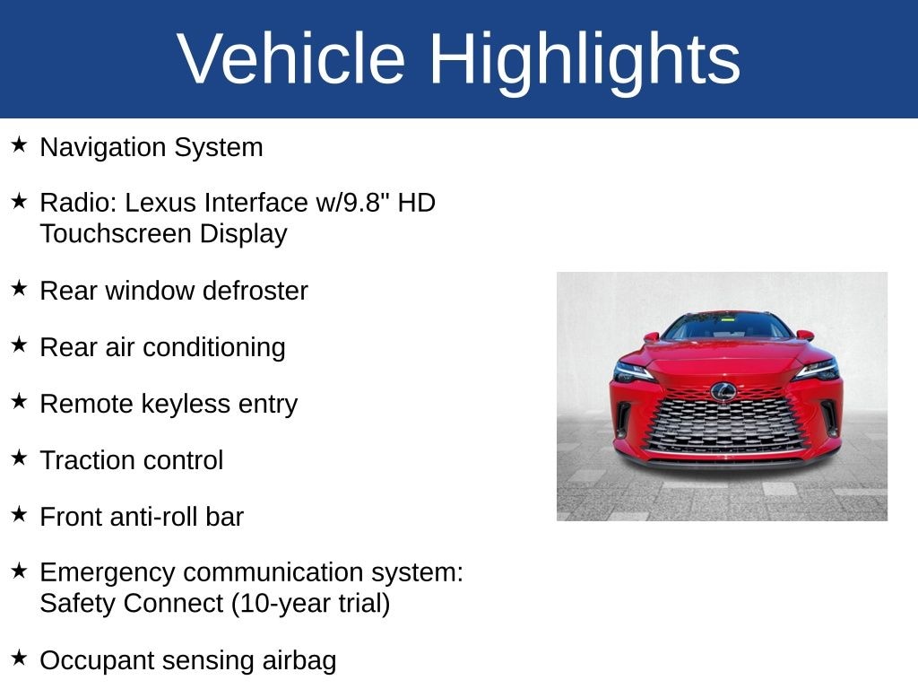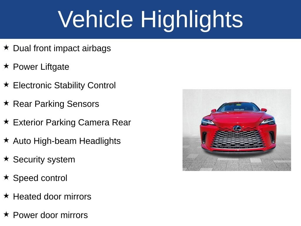RX 350, 4D Sport Utility, 2.4L I4 PDI Turbocharged DOHC 16V LEV3-SULEV30 275hp, 8-Speed Automatic, AWD, Red, Black w/Dark Graphite Aluminum w/F SPORT NuLuxe Seat Trim, 19" Wheels, Auto High-beam Headlights, Auto-dimming Rear-View mirror, Dual front impact airbags, Electronic Stability Control, Emergency communication system: Safety Connect (10-year trial), Exterior Parking Camera Rear, Front anti-roll bar, Front Bucket Seats, Front Center Armrest, Heated door mirrors, Navigation System, Occupant sensing airbag, Power door mirrors, Power Liftgate, Radio: Lexus Interface w/9.8" HD Touchscreen Display, Rain sensing wipers, Rear air conditioning, Rear Parking Sensors, Rear seat center armrest, Rear window defroster, Remote keyless entry, Security system, Speed control, Telescoping steering wheel, Traction control.