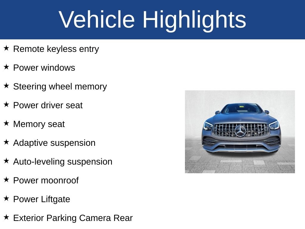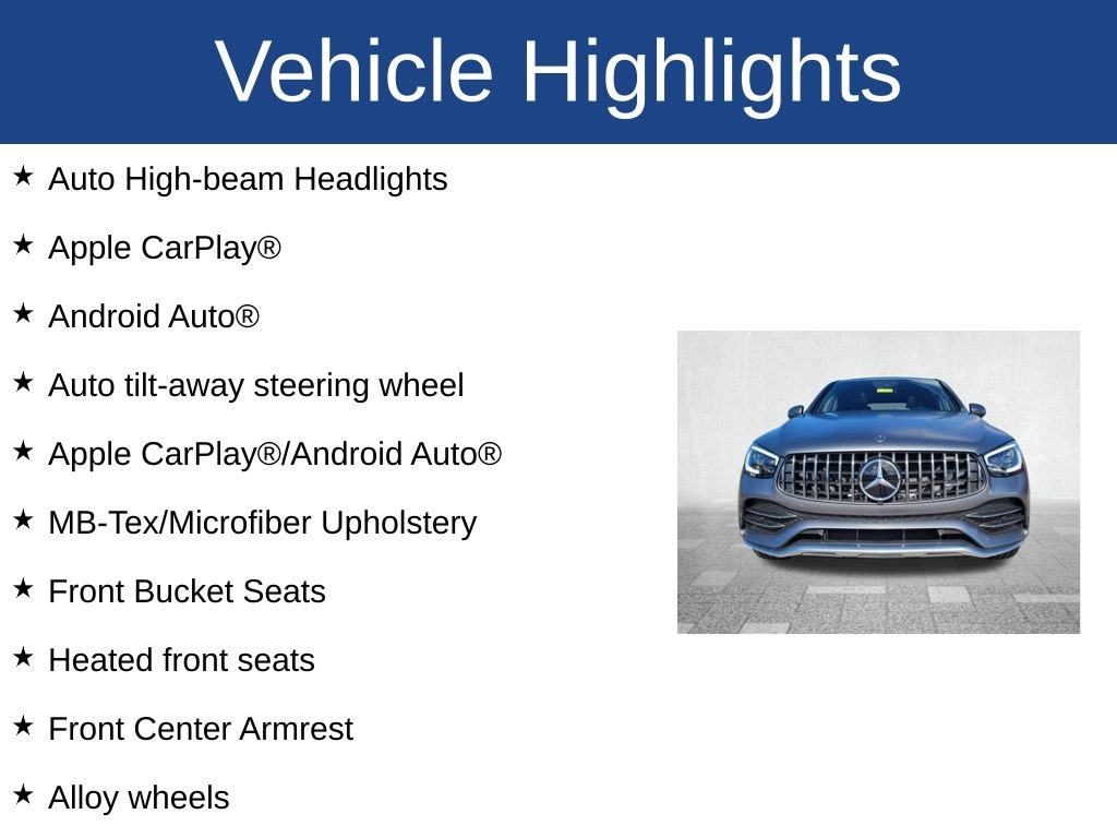 GLC 43 AMG® 4MATIC®, 4D Sport Utility, 3.0L V6 BiTurbo, 9-Speed Automatic, 4MATIC®, Adaptive suspension, Alloy wheels, Android Auto®, Apple CarPlay®, Apple CarPlay®/Android Auto®, Auto High-beam Headlights, Auto tilt-away steering wheel, Auto-leveling suspension, Exterior Parking Camera Rear, Front Bucket Seats, Front Center Armrest, Heated front seats, MB-Tex/Microfiber Upholstery, Memory seat, Power driver seat, Power Liftgate, Power moonroof, Power windows, Remote keyless entry, Steering wheel memory.